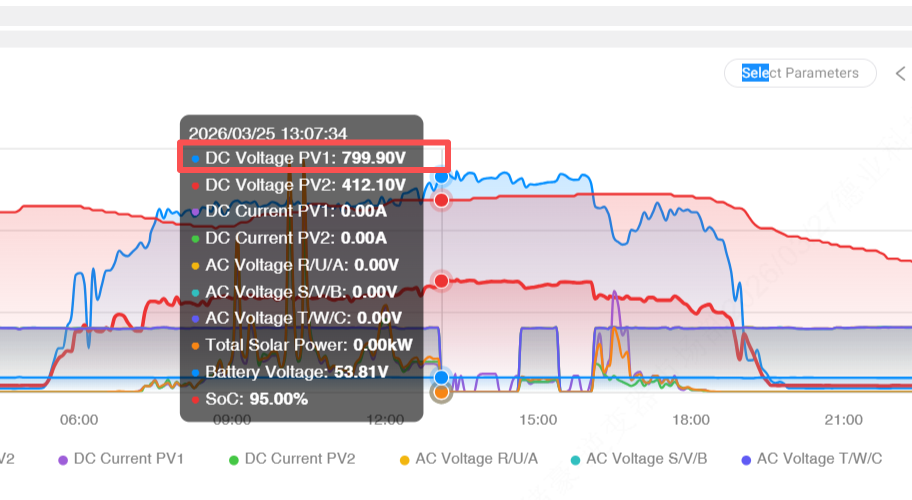Tämä tapaus on tyypillinen: PV1-merkkijonojen määrä on liian suuri, joten avoimen piirin jännite saavuttaa 799,90 V, mikä ylittää huomattavasti invertterin. ' s sallittu syöttö. Voimakkaassa säteilyssä ylijännitesuoja laukeaa väistämättä. Jotkut tapaukset osoittavat myös epätasapainoa PV1:n ja PV2:n välillä moduulityypissä tai merkkijonojen määrässä, jolloin yksi merkkijono ylittää turvallisen jännitteen.